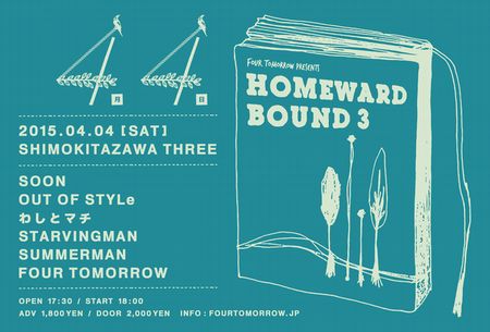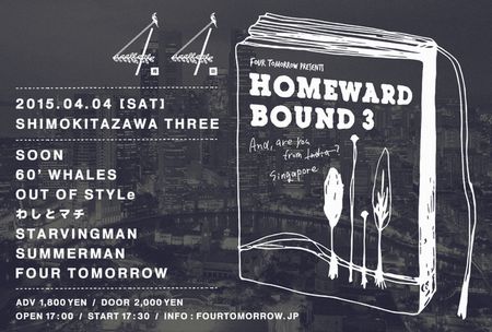 -2015/2/4 update 4月4日の企画詳細! | 4月4日に開催される企画の詳細が決定しました! 僕たちの結成15周年ってのもさらりと合わせて開催です。 皆様お誘い合わせの上、ぜひぜひよろしくお願いいたします! FOUR TOMORROW presents Homeward Bound #3 ------------------------------------------- 2015.4.4(sat) Shimokitazawa Three ------------------------------------------ OUT OF STYLe STARVINGMAN SOON SUMMERMAN わしとマチ FOUR TOMORROW ------------------------------------------ OPEN 17:30 START 18:00 ADV1,800yen Door 2,000yen ![]() We are pleased to announce the detail of “Homeward Bound #3”. It means our 15 th anniversary as well, please come and get drink together!