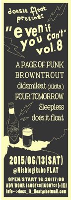 -2017/11/19 update 12月に企画を開催します! | -20171202(Sat)Tokyo Nishiogikubo FLAT FOUR TOMORROW presents [Homeward Bound #6] ================================ -ANGRY NERD -A PAGE OF PUNK -does it float -FOUR TOMORROW -THE URCHIN -わしとマチ ================================ | OPEN 14:00 | START 14:30 | Adv 1,500 | Door 1,800 |