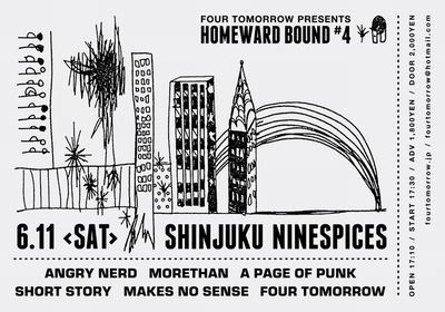-2016/4/24 update 6月企画詳細! | 6月11日の企画の詳細が確定しました! どうぞよろしくお願いします! 2016年6月11日(土)東京新宿NINE SPICES FOUR TOMORROW presents [Homeward Bound #4] ---------------------------------------------------- ANGRY NERD A PAGE OF PUNK MAKES NO SENSE MORETHAN SHORT STORY FOUR TOMORROW ---------------------------------------------------- Open 17:10 / Start 17:30 ADV 1,800yen / DOOR 2,000yen