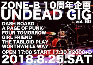 -2018/8/23 update 今週末より新しいTシャツを発売します! | 今週末のZONE-B 10周年お祝いGIGからFOUR TOMORROWの新作Tシャツを販売します! まだまだ夏は終わりません、ぜひこの機会にどうぞ! デザインは完成したらここやTwitterで報告します。 どうぞよろしくお願いします! そして日々徒然もゆるーりとなんとか続けています、こちらもお時間ある方はチェックください! こちらよりLINKで飛べます。 -20180825(Sat)Tokyo Waseda ZONE-B ZONE-B presents [UNDEAD GIG #60 -ZONE-B 10周年GIG-] ================================ -A PAGE OF PUNK -DASHBOARD -FOUR TOMORROW -GIRLFRIEND -THE TABLOiD PLAY -WORTHWHILE WAY ================================ | OPEN 17:00 | START 17:30 | Ticket 2,000 | -20180901(Sat)Tokyo Waseda ZONE-B HIRO presents [BREAK A SCHOOL -OUT OF STYLeレコ発&ZONE-B 10周年GIG-] ================================ -OUT OF STYLe -ANGRY NERD -dear punks -FOUR TOMORROW -SHORT STORT -Town ================================ | OPEN/START TBA | Adv 2,000 | Door 2,500 |
